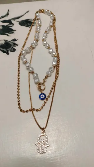 Elegante collana multistrato con un design unico. - Catena a pallini dorata. - Catena sottile dorata. - Collana di perle barocche. - Ciondolo occhio blu con strass. - Ciondolo mano di Fatima con strass.