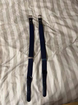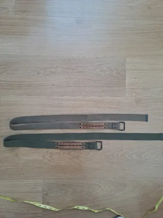 Set di cinture in pelle: - Cintura nera Sam Brown in pelle larga 85cm. - Cintura blu con design traforato e fibbia argentata 108cm. - Cintura in tessuto turchese chiaro con fibbia ovale 101cm. Tutte le cinture sono in pelle e in buone condizioni. Prezzo per tre cinture 15€.