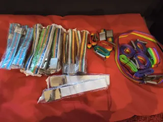 Set di 35 cinture con design vari e fibbie metalliche. Separatamente 1€ l'unità - Varie cinture a righe nei toni del blu, verde, arancione e giallo. - Due cinture bianche lisce con fibbia argentata. - Cinture arrotolate con fibbie metalliche.