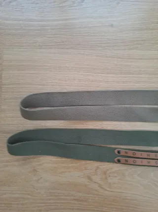 Set di cinture con design moderno e dettagli metallici. - Una cintura in tonalità beige giallo - Una cintura in tonalità verde. - Entrambe con borchie decorative. Sono esattamente come si vedono nelle foto, il verde leggermente staccato, proprio come nelle foto. 2,50 ciascuna.