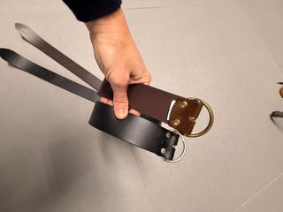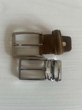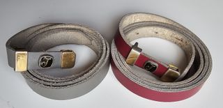 Set di due cinture con fibbia dorata. Una cintura è di colore marrone scuro, lunga 90 cm e larga 3,50 cm. L'altra cintura è rossa, lunga 80 cm e larga 8 cm.