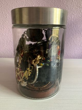 Barattolo di vetro con coperchio metallico pieno di cinture, collane e bracciali. Dettagli dorati, argentati, floreali, nero, marrone, rosso, perle... Design decorativo sul vetro del barattolo. Ci sono articoli nuovi, in ottime condizioni, in buone condizioni e in condizioni accettabili. Il barattolo misura 17 cm di altezza e 11 cm di diametro. Se desideri conoscere il contenuto del barattolo, non esitare a chiedere.