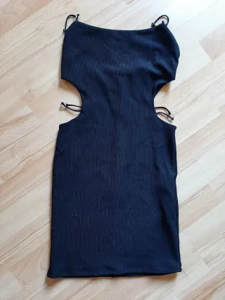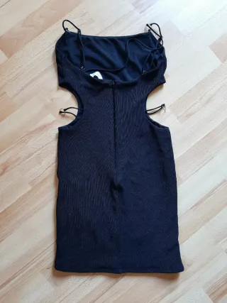 Abito nero con un design moderno e audace. - Tessuto liscio elastico - Tagli laterali. - Dettaglio di cinture e anelli metallici. Le spedizioni hanno un costo aggiuntivo
