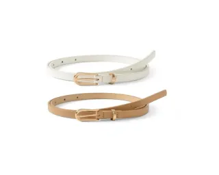 Set di due cinture sottili da donna, una in beige e l'altra in bianco. Entrambe presentano una fibbia dorata. Design sottile ed elegante. Fibbie metalliche dorate.