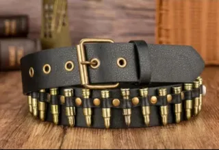 Set di due cinture con design a proiettili. Materiale: pelle sintetica. Fibbia metallica dorata. Decorazione con proiettili dorati.