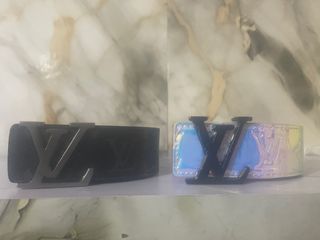 Due cinture con il distintivo logo di Louis Vuitton. - Una cintura in colore nero. - Un'altra cintura con finitura iridescente multicolor.