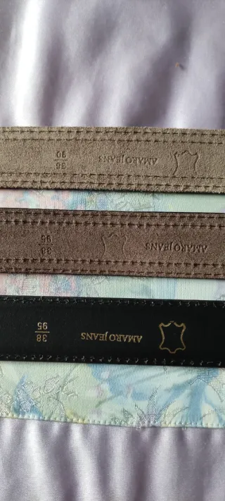 Set di cinture in pelle del marchio Amaro Jeans. - Cintura in pelle rossa. - Cintura in pelle marrone. - Cintura in pelle beige. - Cintura multicolore con dettagli in pelle. Se ne acquisti due, 35 euro.
