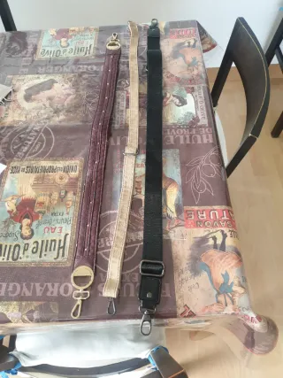 Cinture di ricambio per borsa, con un design moderno e dettagli unici. - Cintura principale in tessuto blu con stampa. - Dettagli in pelle marrone. - Fibbie metalliche per regolazione e fissaggio. - Cintura aggiuntiva in tessuto beige satinato.
