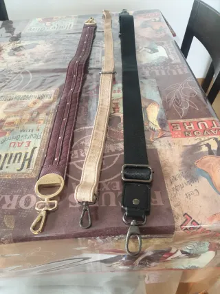 Set di tre cinture versatili per borse, ideali per personalizzare o sostituire. - Cintura in similpelle con borchie. - Cintura in tessuto con texture. - Cintura in nylon regolabile. Ogni cinturino costa 1 euro, la nera e la beige sono estensibili.