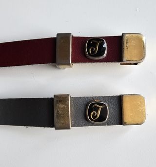 Vendo due cinture in pelle di colore grigio e granato, con una I o J sulla fibbia dorata. Lunghezza 100 cm, larghezza 1,5 cm. La fibbia è leggermente usurata ma quasi impercettibile. Chiusura metallica. Entrambe le cinture a 6€