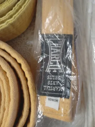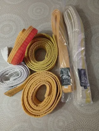 Set di cinture per arti marziali in diversi colori. Include cinture bianche e gialle. - Cintura bianca - Cintura gialla (2 usate e una nuova marca Charlie) - Cintura gialla e arancione - Cintura bianca e gialla in borsa con etichetta, nuova. Si vende tutto il set o separatamente
