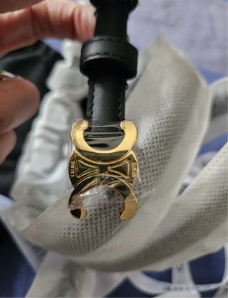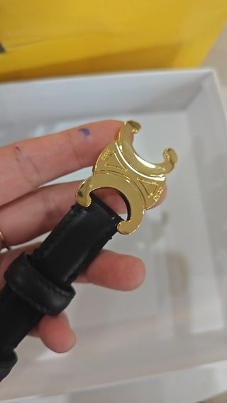 L'ho acquistata perché mi è piaciuto il suo design discreto ed elegante, ma alla fine la uso quasi mai. È in ottime condizioni, con la sua scatola e la fattura originale. Ideale per dare un tocco chic a qualsiasi look. - Fibbia con l'iconico logo Triomphe in finitura dorata. - Materiale lucido e liscio. - Include una borsa protettiva in tessuto nero.