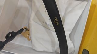 Marca: CELINE Tamaño: 95 Esta cinturón la compré en la tienda oficial de Cèline . Cinturon negro con la hebilla dorada. Viene con la caja y la bolsa de polvo original y el tiquet de compra. La talla es 95, con un ancho de 2,5 cm y una longitud de 110 cm.
