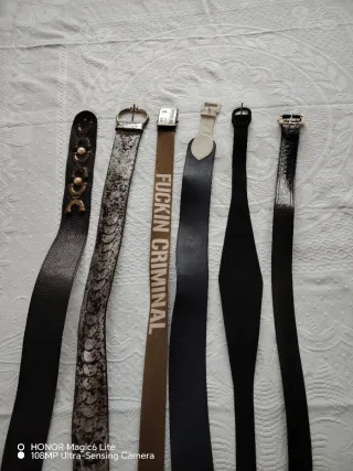 Cinture da donna di diversi stili. Si vendono separatamente o insieme se ti interessa più di una. Cintura nera intrecciata. 2 euro Cintura nera con fibbia argentata. 2 euro Cintura nera con borchie. 1 euro Cintura elastica rossa con fibbia dorata. 3 euro