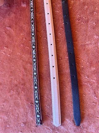 Set di tre cinture sottili da donna poco usate, si può notare nelle immagini la differenza di lunghezza, circa taglia 80 cm. - Una cintura con design intrecciato e dettagli metallici. - Una cintura liscia in tono rosa pallido. - Una cintura liscia in nero. - Con vari fori regolabili.