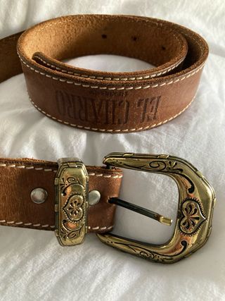 Cinturone in pelle con design classico e dettagli metallici. Fibbia dorata con ornamenti. Ricamo El Charro sul cuoio. Cuciture bianche decorative.