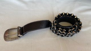 - Cintura nera con ricamo floreale dorato. - Cintura marrone con texture di serpente e fibbia tonda.