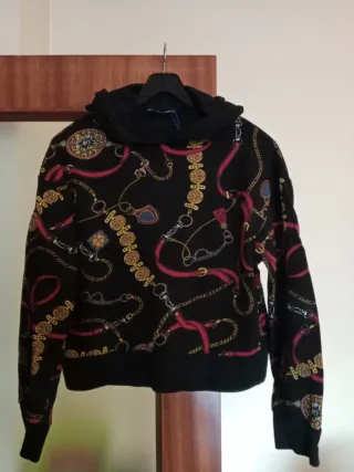Felpa con un accattivante stampa di catene e cinture. Design a collo tondo. Manica lunga. Polsini ed elastico in vita.