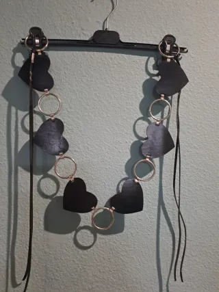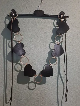 Cintura da donna con un design originale di cuori e dettagli argentati. Lunghezza 81 cm. Cuori neri. Fasce lunghe per l'adattamento 48 cm. In perfette condizioni.