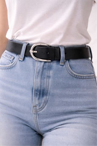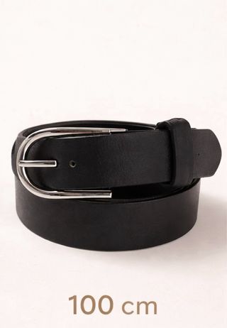 Cintura nera elegante con fibbia argentata. Design moderno e versatile. Materiale di qualità. Adatto a varie misure di vita.