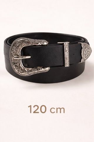 Cintura da donna con un design elegante e moderno. - Fibbia argentata con dettagli incisi. - Cinturino in similpelle nero. - Dettaglio a punta sulla punta del cinturino.