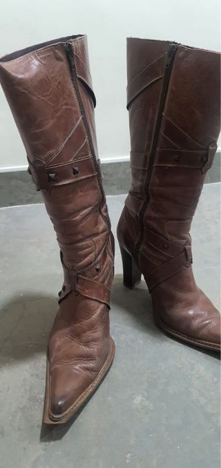 Stivali alti in pelle con un design moderno e dettagli unici. Materiale: pelle. Colore: marrone. Chiusura con cerniera laterale. Adoramenti metallici e cinture decorative. Punta a punta. Tacco alto.
