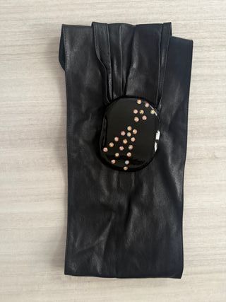 Elegante cintura da donna in pelle nera, impreziosita da un dettaglio ovale lucido con strass colorati. - Dettaglio decorativo con strass 95 cm