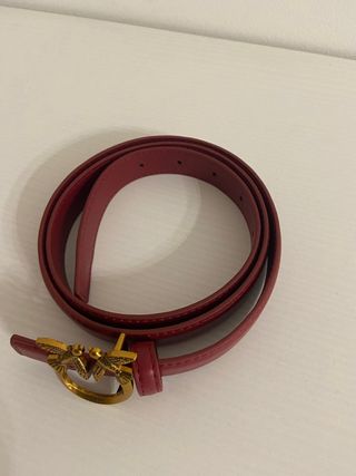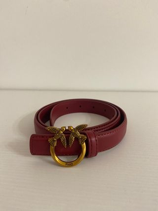 Elegante cintura Pinko in pelle rossa, un accessorio iconico per completare ogni outfit. - Fibbia a forma di doppio uccello dorato. - Logo PINKO inciso sull'anello.
