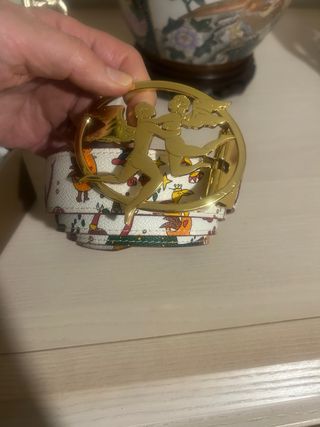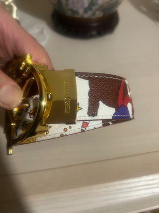 Cintura con una fibbia dorata decorata con figure stilizzate e una stampa colorata. - Fibbia in metallo dorato. - Stampa vivace con disegni. - Design unico e originale.