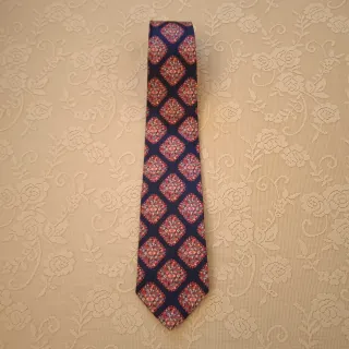 Cravatta vintage con un motivo decorativo. - Fantasia a rombi con dettagli floreali. - Colori predominanti blu scuro, rosso e rosa.
