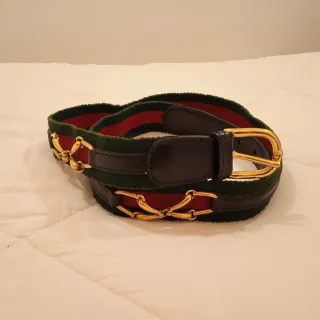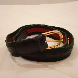 Cintura elegante e versatile. Foro centro 95 cm. Altezza cm.3,5. - Tessuto a righe verdi e rosse. - Dettagli in pelle nera. - Fibbia dorata a forma di U con catena a maglie dorate design morsetti da cavallo.
