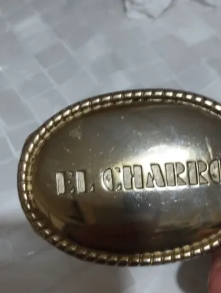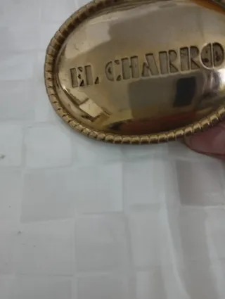 Fibbia vintage originale degli anni '60, con finitura dorata. Al rovescio il metallo è un po' usurato,come evidenziato in fotografia. - Design ovale con bordo decorato. - Incisione El Charro al centro.