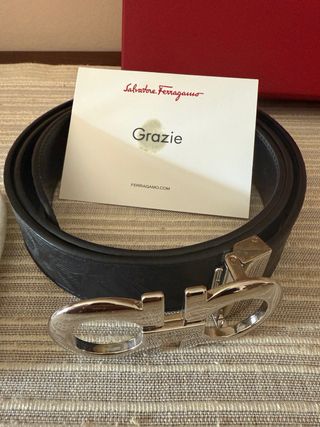 Cintura Salvatore Ferragamo in pelle nera, utilizzata pochissimo. - Fibbia iconica con doppia G in metallo argentato. - Design elegante e versatile. - Made in Italy.