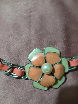 Elegante cintura gioiello regolabile, perfetta per aggiungere un tocco di stile. - Decorata con fiori smaltati. - Dettagli con perle. - Catena metallica color argento. - Inserti in similpelle color corallo.