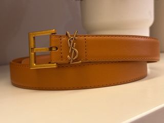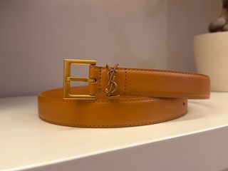 Elegante cintura in pelle color cuoio con fibbia dorata. - Logo Saint Laurent dorato. - Pelle liscia e rifiniture curate.