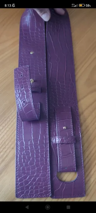 Cintura Camomilla in ecopelle viola con finitura effetto coccodrillo. Lunghezza 100cm. - Design elegante e raffinato. - Dettagli con borchie dorate.