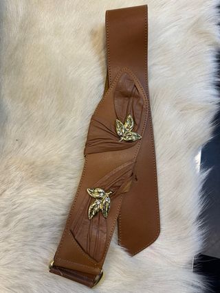 Elegante cintura in cuoio, un accessorio che aggiunge un tocco di stile. - Materiale: cuoio - Dettagli: applicazioni dorate a forma di foglia - Chiusura: fibbia dorata