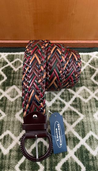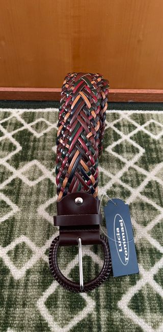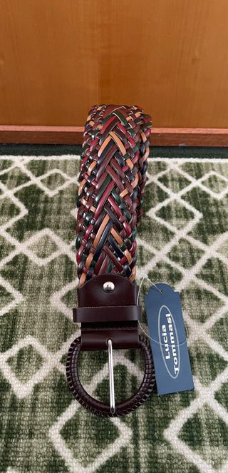 Cintura da donna in vera pelle, lunghezza 105 cm. - Design intrecciato multicolore. - Fibbia rotonda in metallo. - Marchio Lucia Tommasi.