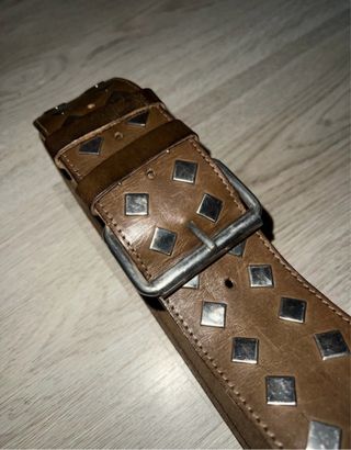 Elegante cintura in pelle marrone, perfetta per completare ogni outfit. - Dettagli con borchie a forma di rombo. - Fibbia in metallo argentato.