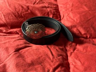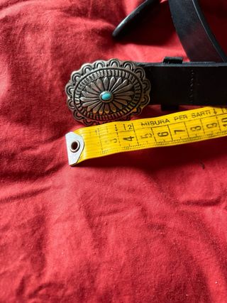 Elegante cintura vintage con una fibbia decorata in stile western, lunghezza cintura 100 cm con altezza di 3 cm. Fibbia ovale di circa 5 cm. - Fibbia ovale in metallo argentato. - Dettaglio centrale in turchese. - Design inciso con motivi floreali.