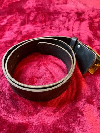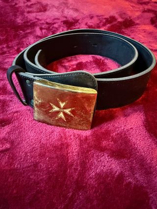 Cintura da uomo con fibbia decorata con la croce dell'Ordine di Malta. - Divisa barelliere - Fibbia in metallo dorato. - Cintura in pelle nera. - Lunghezza circa 140 cm - Ottimo stato: la cintura in pelle deve essere ingrassata mentre la fibbia presenta graffi dovuti all’uso #cintura #ordinedimalta #divisa #barelliere