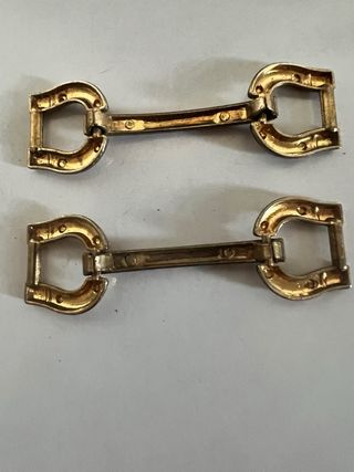 Set di due fibbie in metallo dorato. 2 fibbie a staffa che possono essere usate come fermagli per scarpe/borse, dato il loro design che ricorda una staffa da equitazione. Il loro scopo è funzionale (tenere insieme due parti) e decorativo. - Dettagli con rivetti.