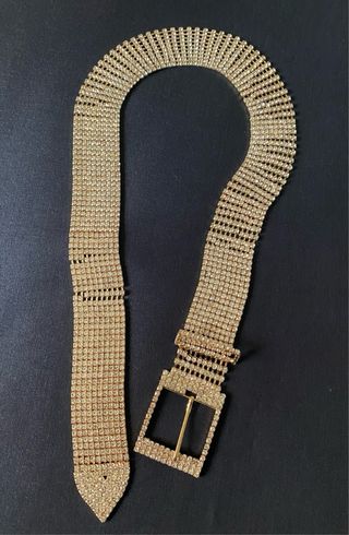 Elegante cintura con strass dorati, perfetta per aggiungere un tocco di luce ai tuoi outfit. - Design a rete con cristalli scintillanti. - Fibbia quadrata decorata. - Lunghezza regolabile.