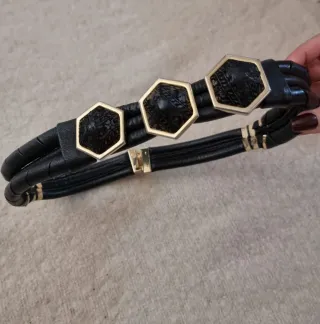 Cintura strutturata in pelle composta da 3 fasce lavorate, un pezzo unico dal fascino vintage. - Design geometrico con inserti esagonali. - Dettagli in oro. - Realizzata in Italia, artigianale Misura totale compresi i ganci cm 74