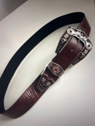 In vera pelle con fibbia smaltata in tinta del fusto e strass mai usata era un campione poi non è andato in produzione per un brand centimetri 86 foro centrale si può accorciare il fusto con la vite come da foto