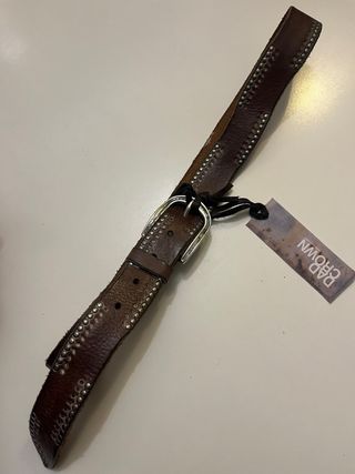 In pelle con borchiette in metallo misura lunghezza 108x4,5 cm. Condizioni in buono stato come da foto.