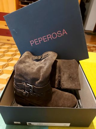 Stivaletti in camoscio marrone/torba. - Modello tronchetto. - Dettagli con fibbie e borchie. - Zip laterale per facilitare la calzata.