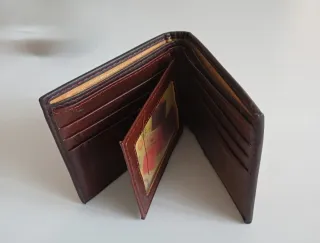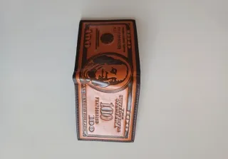 Portafoglio con un design unico ispirato alla banconota da 100 dollari. - Materiale in similpelle. - Dettagli in rilievo. - Colore marrone e oro.