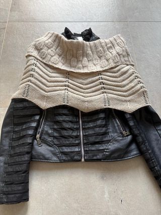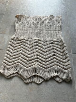 Elegante coprispalla in maglia beige con dettagli a pois e motivo a zig-zag. Si abbina perfettamente a una giacca nera. - Maglia lavorata a mano. - Design a collo alto. - Finitura a coste.