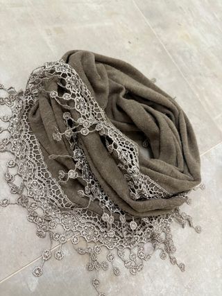 Elegante sciarpa con dettagli in pizzo. Un accessorio raffinato per completare il tuo look. - Bordi rifiniti con pizzo lavorato. - Nappine decorative pendenti.